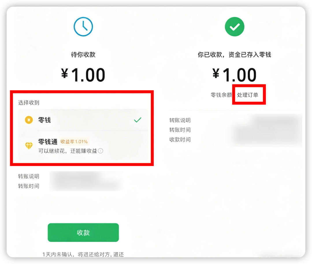 收款完成后,另一个小变化出现在零钱余额旁——新增了「处理订单」入口。