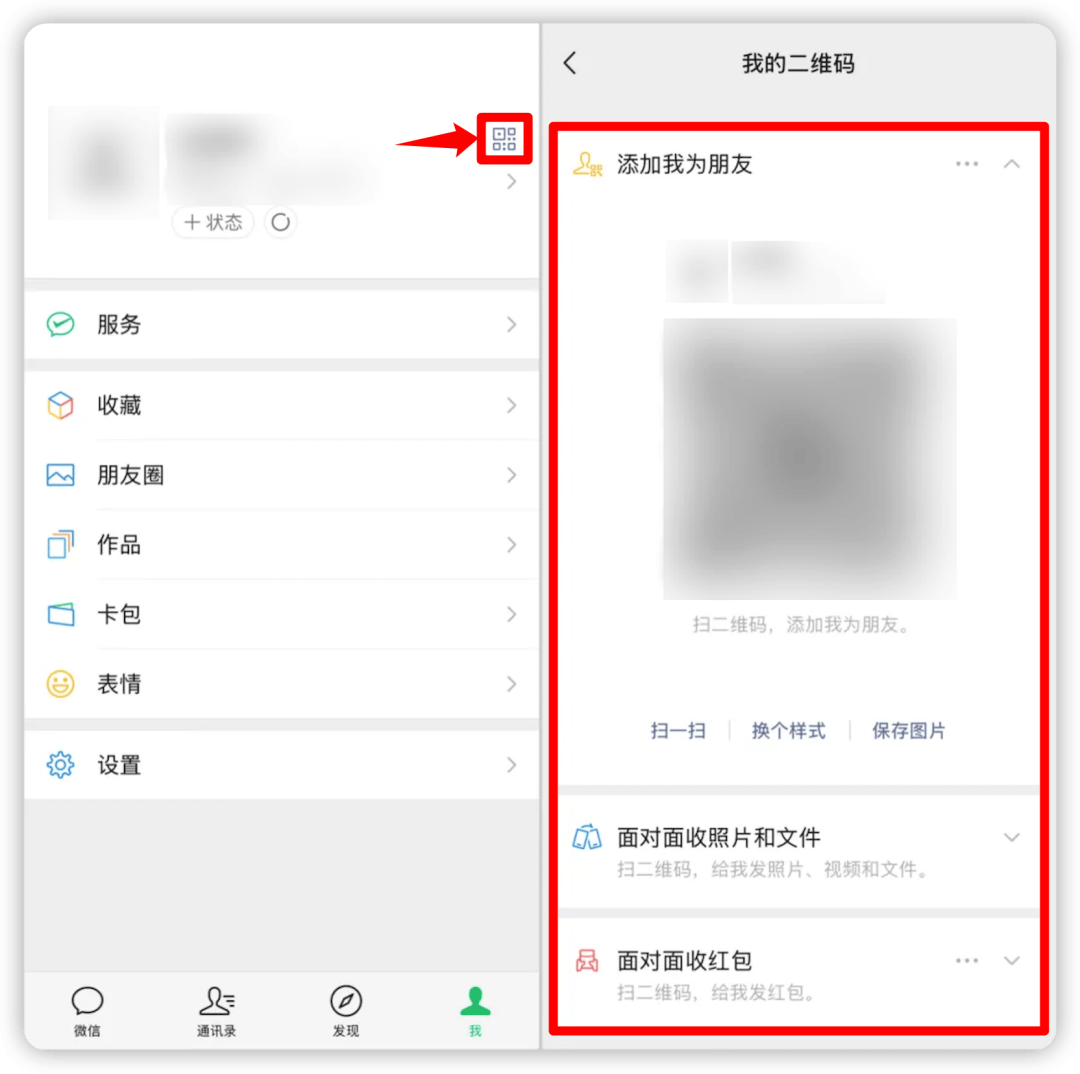 在「我」界面,点击个人昵称最右侧的那个二维码小图标,就会弹出一个全新的界面。